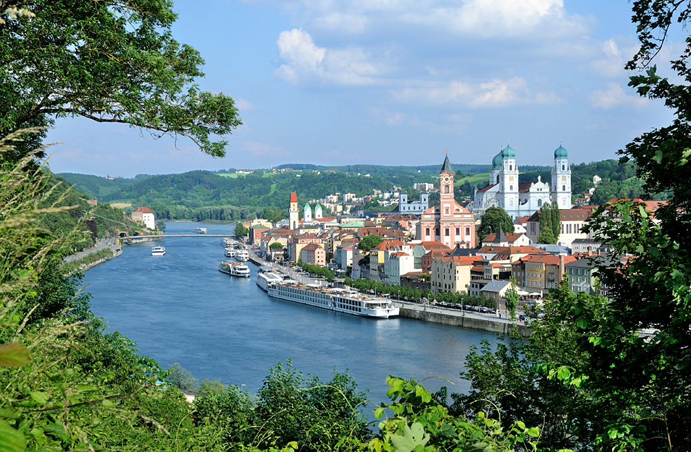 3-Flüsse Stadt Passau ist eine Stadt der Superlative. Im Passauer Dom ertönt die größte Kirchenorgel der Welt und das Flair der jungen Altstadt hat schon so manchen verzaubert. Das Passauer Drei-Flüsse-Eck ist weltweit die einzige Stelle, an der drei Flüsse aus drei verschiedenen Himmelsrichtungen kommend zu einem Fluss zusammen fließen. Vom Norden her die Ilz, vom Westen die Donau und aus dem Süden der Inn.